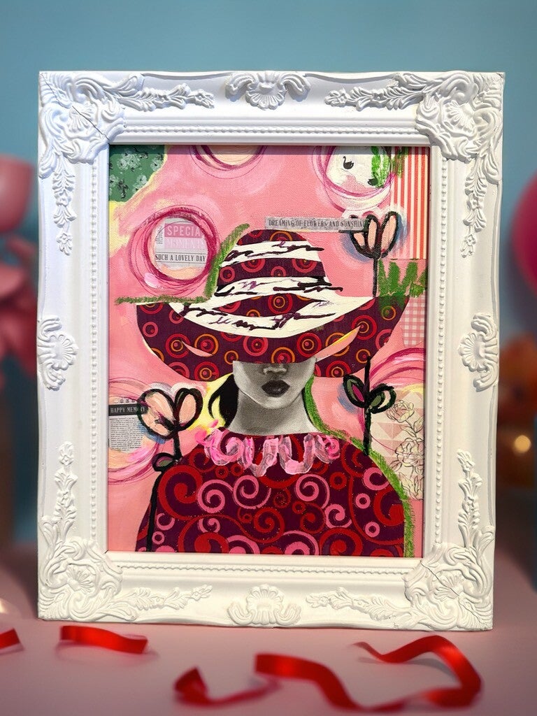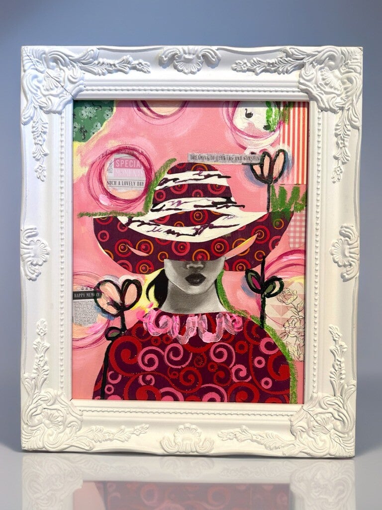 11x14" Mixed Media, Collage on panel, fremed in white ornate frame.